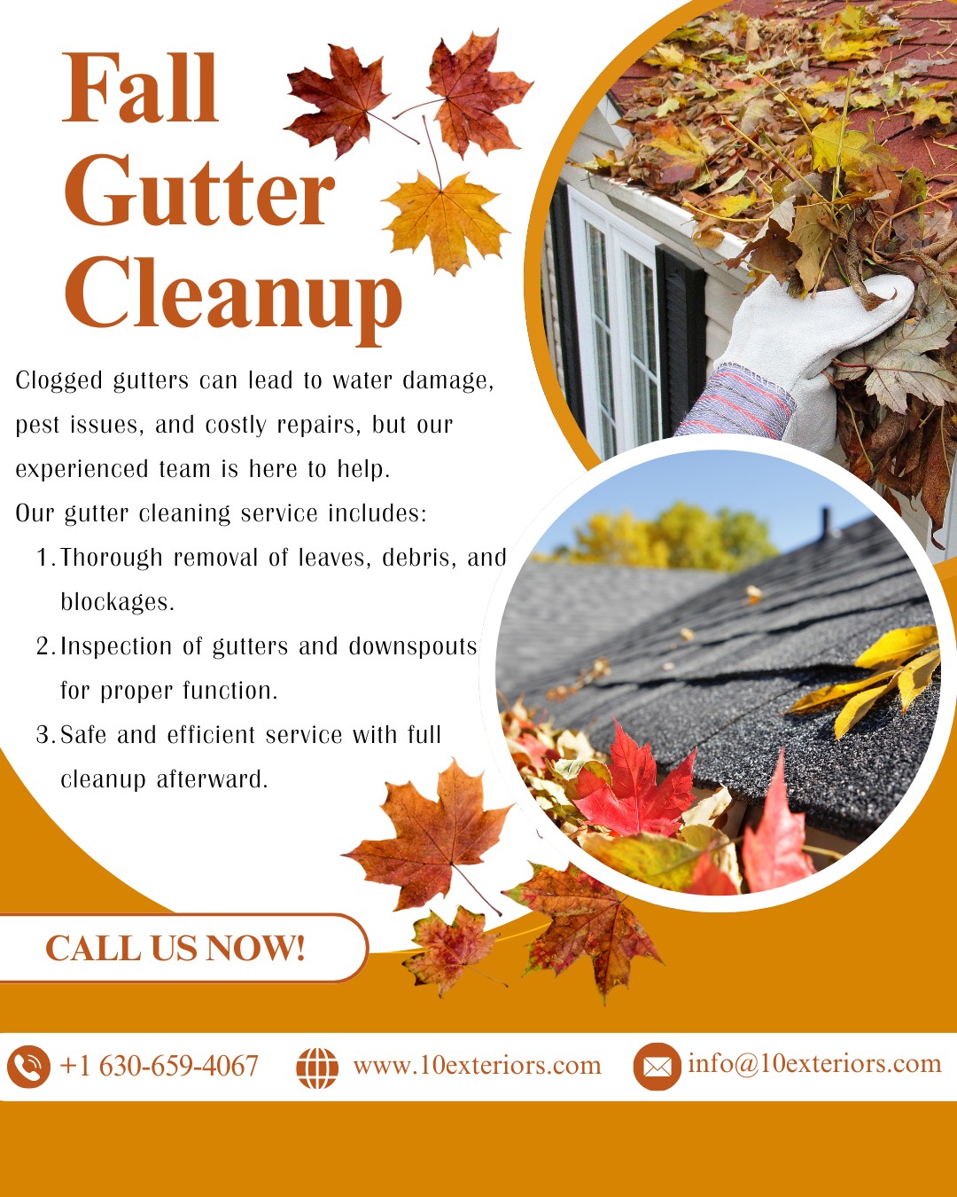 Clogged gutters can lead to water damage, pest issues, and costly repairs, but our experienced team is here to help. Our gutter cleaning service includes: 1. Thorough removal of leaves, debris, and blockages. 2. Inspection of gutters and downspouts for proper function. 3. Safe and efficient service with full cleanup afterward