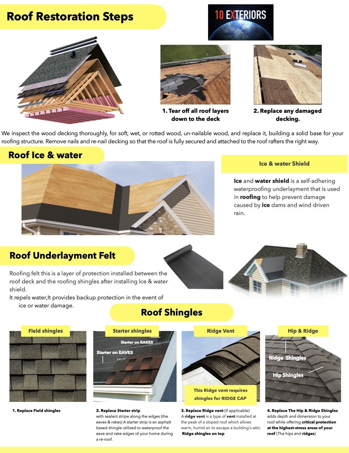 What are the steps in restoring your roof? Damage to a home’s roof, no matter how slight, can lead to much bigger issues over time. Broken shingles or shakes can lead to leaks, which can threaten the structural integrity of the home and lead to other costly (and even dangerous) issues, such as mold. At 10 Exteriors, our team employs a through and detailed process for inspecting and restoring your roof back to prime condition. 1. Tear off all roof layers down to the deck. 1. Tear off all roof layers down to the deck. 2. Replace any damaged decking. 2. Replace any damaged decking. Roof Decking A roof is only as good as the structure on which it's based - the decking. We first inspect the wood decking thoroughly for soft, wet, rotted or un-nailable wood and then replace it. During this step we will remove extra nails and re-nail the decking to ensure that the roof is fully secured and attached to the rafters. Roof Ice and Water Shield Roofs are made of consecutive underlayments, each one working with the others to provide maximum protection. One of these is an ice and water shield. This is a self-adhesive waterproofing underlayment that helps prevent damage caused by ice dams (a ridge of ice that forms at the edge of a roof preventing melting snow from draining) and wind-driven rain. Roof Underlayment Felt Also known as roofing felt or roofing tar paper, this is a key layer of protection installed between the roof deck and the roofing shingles after installing ice and water shield.This layer is comprised of a base made from natural materials (such as wood cellulose) or synthetic ones (such as fiberglass or polyester), which is then saturated with a protective coating such as asphalt, also known as bitumen. Roofing felt repels water while still allowing the product to breathe. Roof Shingles Asphalt roofs are installed starting at the eaves, the horizontal lowest level of the roof, and working up to the roof ridge from the bottom up. This way, every shingle is overlapped by the shingle above it to keep the water flowing down the roof and into the gutters. A shingled roof is made up of several elements, plus the underlayment layers. 1. Replace Field Shingles 2. Replace Starter Strip With sealant stripe along the edges (the eaves & rakes) A starter strip is an asphalt based shingle utilized to waterproof the eave and rake edges of your home during a Re-roof. 3. Replace Ridge Vent (If applicable). A ridge vent is a type of vent installed at the peak of a slopped roof which allows warm, humid air to escape a building’s attic. Ridge shingles goes on top. 4. Replace Hip & ridge Shingles Adds depth and dimension to your roof while offering critical protection at the highest-stress areas of your roof (the hips and ridges) Starter Strip With sealant stripe along the edges, (the eaves and rakes) a starter strip is an asphalt based shingle used to waterproof the eave and rake edges of your home. These are the first elements to be installed. Field Shingles These make up the majority of shingles on the roof. Starting from the lower portion and working up to the ridge, each row of shingles is positioned so that they overlap the previous row. Normally four nails are used to secure each shingle, though six are used in high wind areas. Field shingles have an adhesive strip that bonds to the shingle installed above it. The sun helps melt the adhesive to create and even stronger bond. Ridge Vent Some homes have a vent at the peak of the roof which allows warm, humid air to escape a building's attic. This known as a ridge vent or continuous vent. Rather than interrupting the roof line like other raised vents, a ridge vent is so low-profile that it's almost unnoticeable. Hip and ridge Shingles These shingles are found at the highest point of a sloped roof. They add depth and dimension to your roof while offering critical protection at the highest-stress areas - the hips and ridges where the slopes of your roof meet. Roof flashings & vents Anything that interrupts the field of shingles, such as a skylight or chimney, needs flashing to divert water from the interruption onto the surface of the shingles. Flashing and vents are often thought of as the weak points of any roofing system. They are often the first place an inspector will look when trying to track down the source of a leak, assuming no other obvious damage is present. During a roof restoration, flashing is always replaced with new material to avoid leaks caused by old nail holes or material wear and tear. Flashing & vents attached to shingles & felt deteriorate DUE to Roof tear off. Re using flashings with nail holes & warped may cause leaks. Gutter Aprons and Drip Edges At a glance, gutter aprons and drip edges may look like essentially the same thing, however there are differences. A gutter apron is a long piece of metal folded at about 120 degrees, and is designed to direct rainwater directly into the gutter. The apron is normally installed